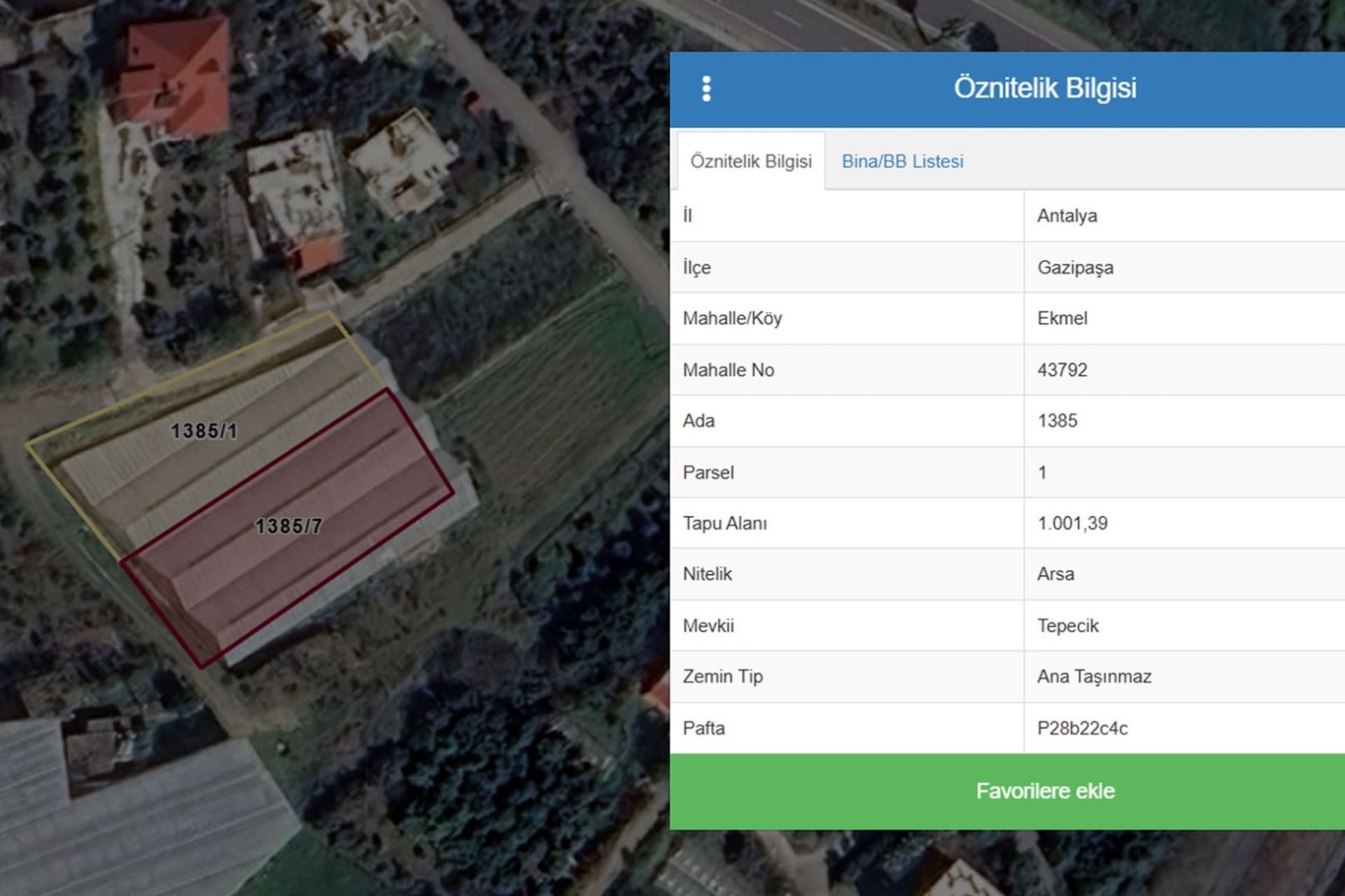 1.001 m2В районе Газипаша Экмель выставлен на продажу земельный участок под застройку жилого дома площадью 1001 м². Участок с кадастровым номером 1385, участок 1, имеет ровную поверхность. С площадью застройки 200 м², площадью строительства 400 м² и разрешением на строительство 2 этажей + крыша, он подходит для инвестиционных и жилых проектов.